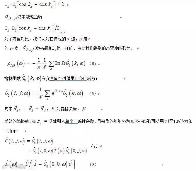 波的配对对称性,并利用杂质效应,研究单个非磁性杂质诱导的杂质共振态,为判断超导的配对对称性提供理论依据,从而揭示其中的非常规超导机理[20,21,22]。