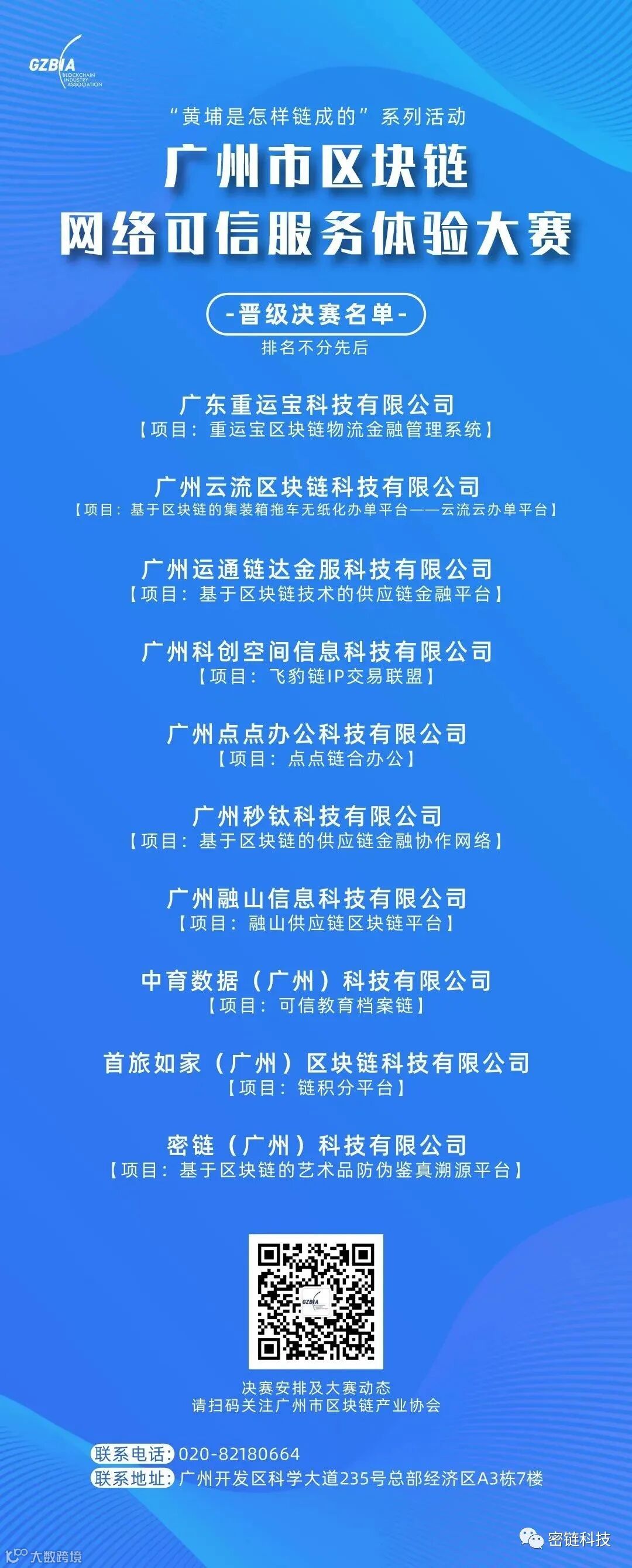 2020年8月12日,全国首场可体验的区块链大赛——“黄埔是怎样链成的”·广州市区块链网络可信服务体验大赛在广州科学城总部经济区开赛,首批20支区块链参赛队伍展开激烈角逐,由专业评委从应用前景、商业模式、技术运用、创新性、展示性、体验性等多个角度进行综合评分,参赛应用10强已正式出炉,分别是:广东重运宝科技有限公司、广州云流区块链科技有限公司、广州运通链达金服科技有限公司、广州科创空间信息科技有限公司、广州点点办公科技有限公司、广州秒钛科技有限公司、广州融山信息科技有限公司、中育数据(广州)科技有限公司、首旅如家(广州)区块链科技有限公司、密链(广州)科技有限公司(以上排名不分先后)。