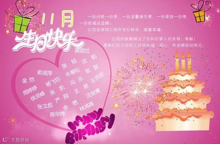 公司全体同仁祝你生日快乐、甜蜜幸福!公司的发展倾注了你和你家人的支持、奉献!愿我们在今后的工作中和谐、同心,共创美好的明天!