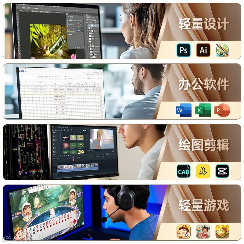 配备了多种类型的输入输出接口,如USB接口、HDMI接口、VGA接口、音频接口、读卡器接口等,方便用户连接各种外部设备,如打印机、扫描仪、摄像头、音箱 游戏手柄等,满足多任务并行需求。
