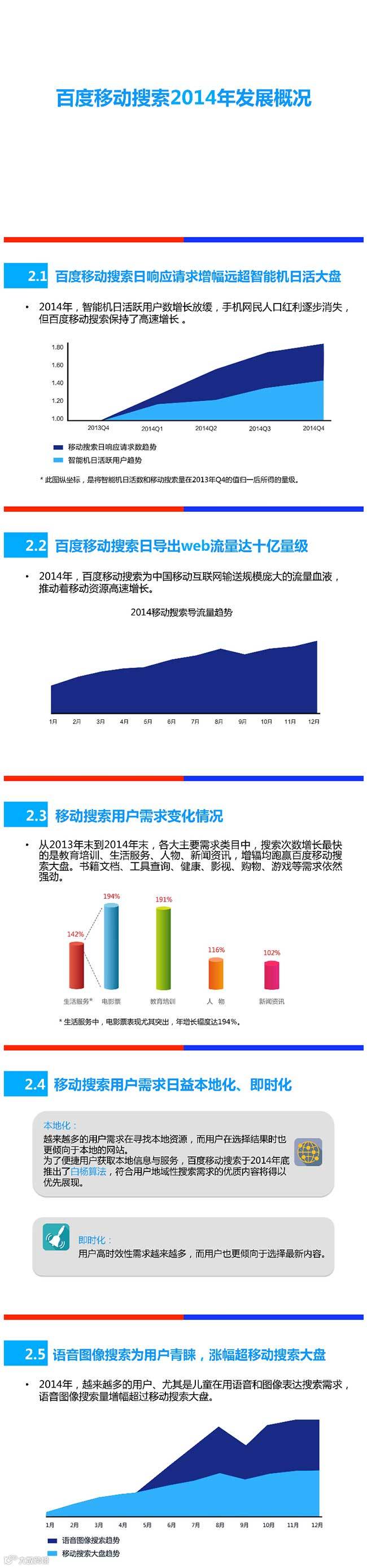 百度今日对外发布了《2015年中国移动网站趋势报告》,报告指出,语音和图像搜索等搜索方式增幅超过了移动搜索,而生活服务、教育培训和新闻资讯将成2015年移动搜索主要需求。