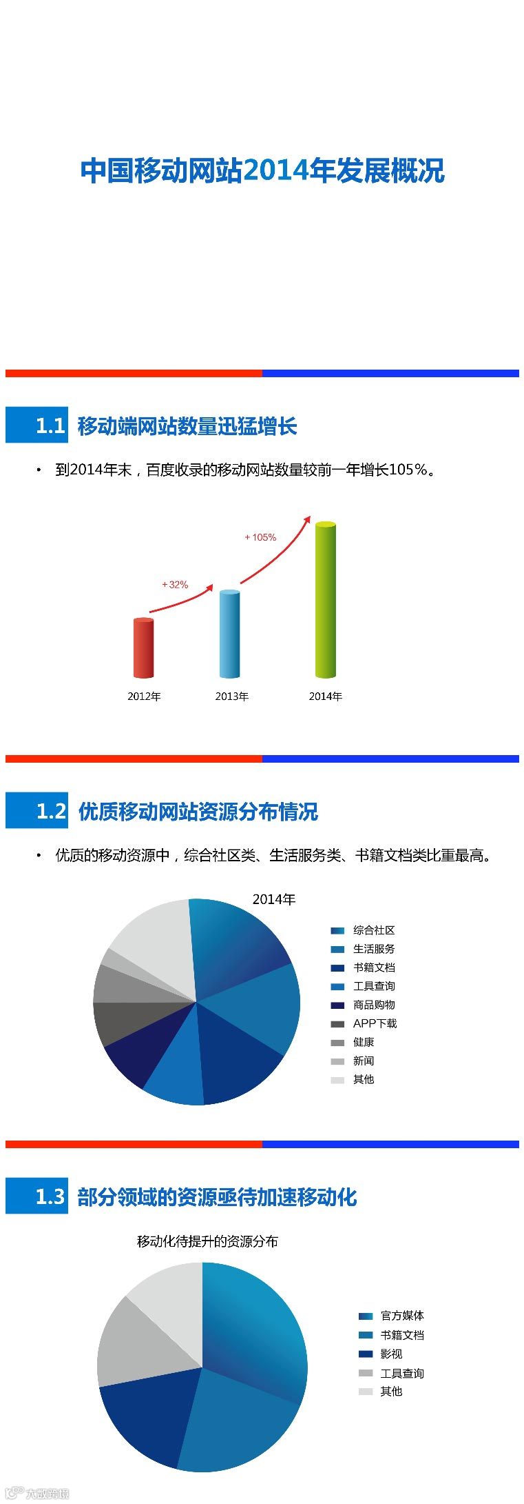 对于未来的移动网站发展,报告预测,2015年移动需求缺口最大的将会是生活服务、教育培训和新闻资讯,这三个领域将驱动移动生态发展。