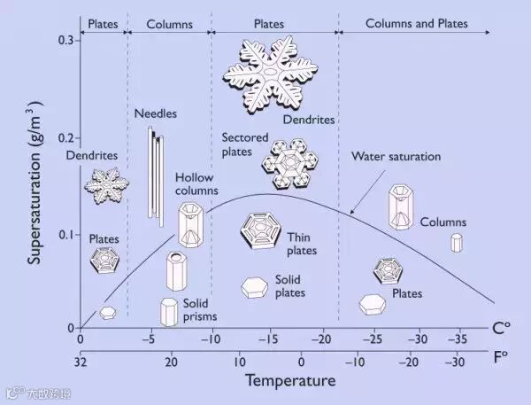 回到正题,雪花的形状与温度和湿度有很大关系,下面这张图就解释了这一现象。在湿度较低时,雪花的形状更简单,而湿度较高时,雪花的形状更复杂。我们现在还不知道形成这些具体形状背后所需的条件,不过研究者们一直都在利用理论方程预测雪花的形状。
