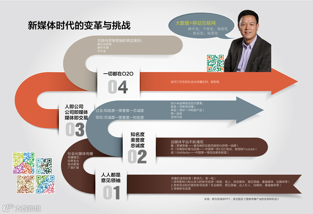 在新媒体时代,移动互联网裹挟着大数据,如滔滔洪水般迎面扑来。面对其中的变革与挑战,是坐以待毙,还是有所准备,抉择全在一念之间。站在时代中央,反而要对猝不及防有所防备才是。北京海天网联营销传播机构董事副总裁杨为民对新媒体的变革和挑战做出了自己的思考和总结。