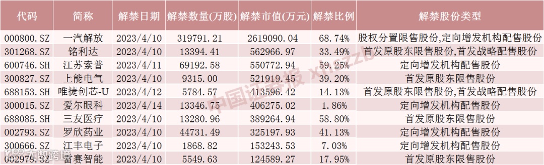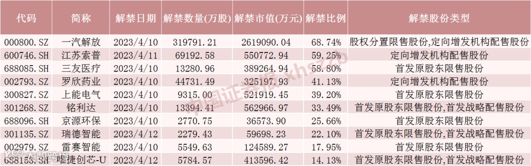 具体来看,Wind数据显示,一汽解放4月10日将解禁31.98亿股,为股权分置限售股份和定向增发机构配售股份。铭利达4月10日将解禁1.34亿股,为首发原股东限售股份和首发战略配售股份。江苏索普4月11日将解禁6.92亿股,均为定向增发机构配售股份。上能电气4月10日将解禁9315.00万股,均为首发原股东限售股份。