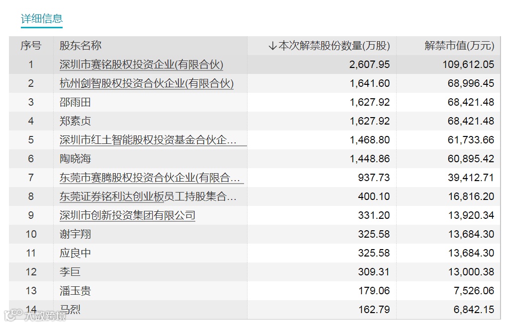 铭利达解禁股东分别为深圳市赛铭股权投资企业(有限合伙)、杭州剑智股权投资合伙企业(有限合伙)、邵雨田等14个股东。