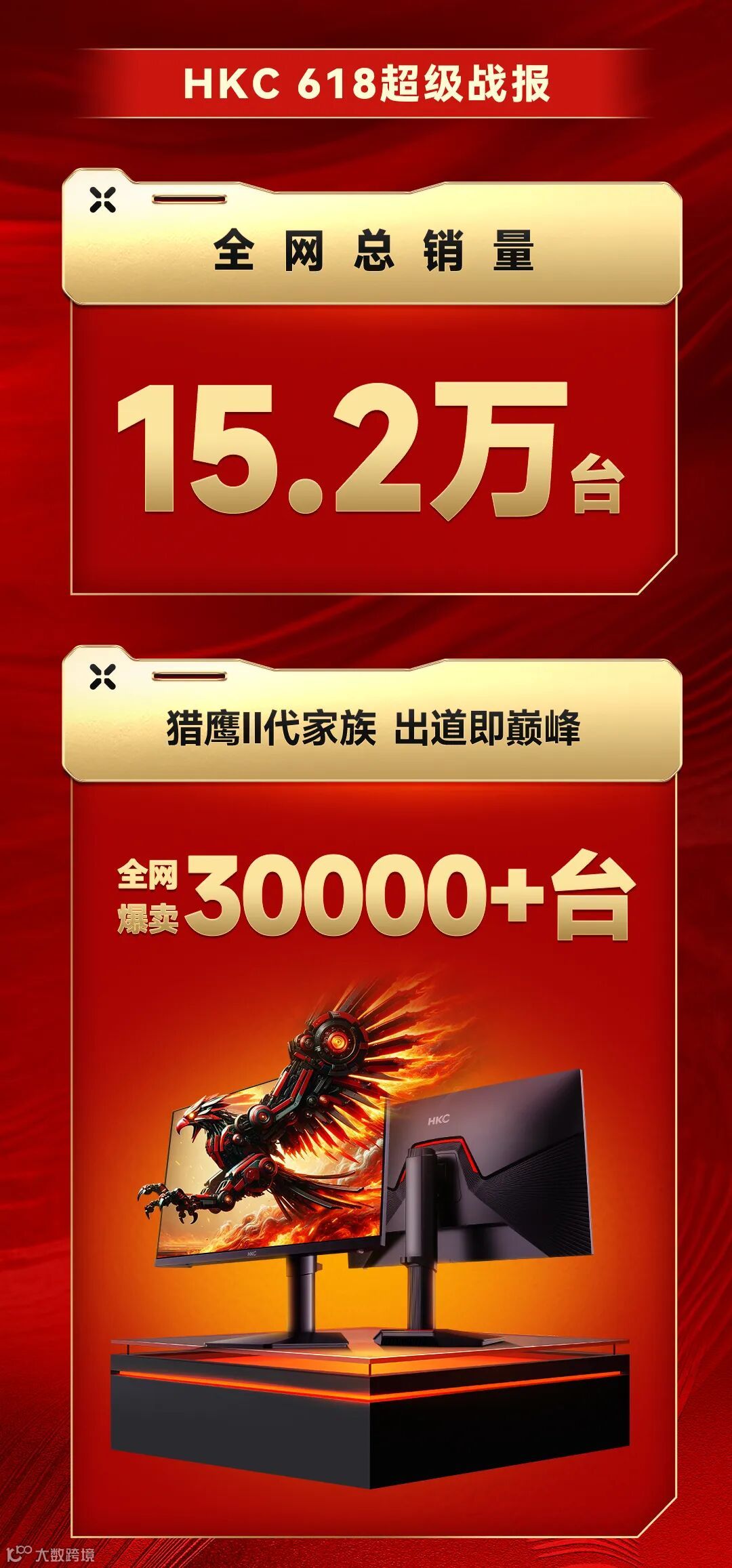 5月HKC推出猎鹰二代新品,获得过红点奖的外观设计搭配卓越的性能,升级过后的猎鹰系列产品一经发售在618期间就爆卖30000+台,再结合之前OG27QK、MG27Q、VG273U PRO、IG27Q等爆款产品,使HKC显示器在电竞领域保持了强劲的发展势头。