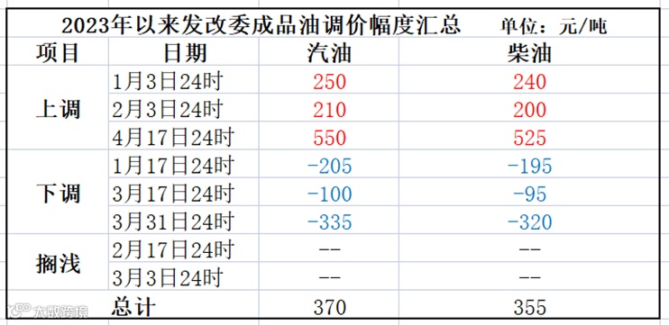 截至目前,2023年国内成品油零售限价共历经8次调整,其中3次上调,3次下调,2次搁浅。涨跌互抵后,标准汽油价格累计上调370元/吨,标准柴油价格累计上调355元/吨,折合成升价后,92#汽油、95#汽油、0#柴油价格累计分别上涨0.29元/升、0.31元/升、0.30元/升。