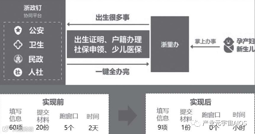 以出生一件事为例,原先办理预防接种、出生医学证明、落户、参保登记、社保卡申领等出生事项需要跑5个窗口、填写60项信息、提交20份材料,现在只需跑1个窗口、填写9项信息、提交1份材料(见图7–8)。