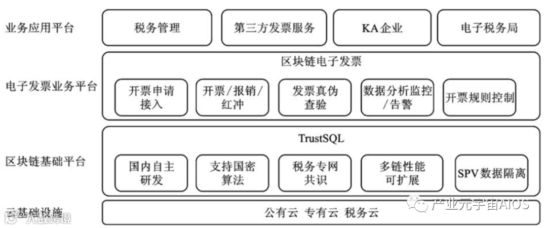 腾讯区块链为区块链电子发票提供底层区块链服务能力,从架构上分为业务应用平台、电子发票业务平台、区块链基础平台及云基础设施(图14-2)。