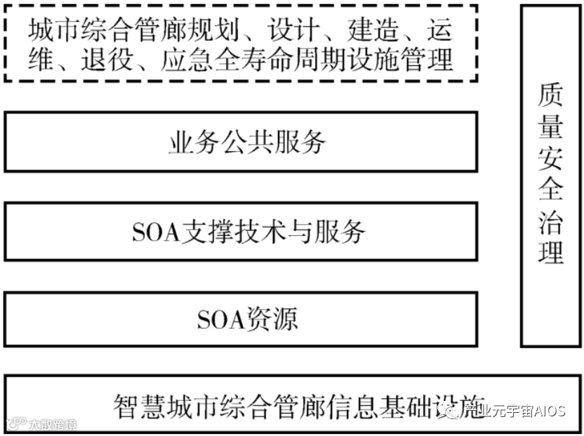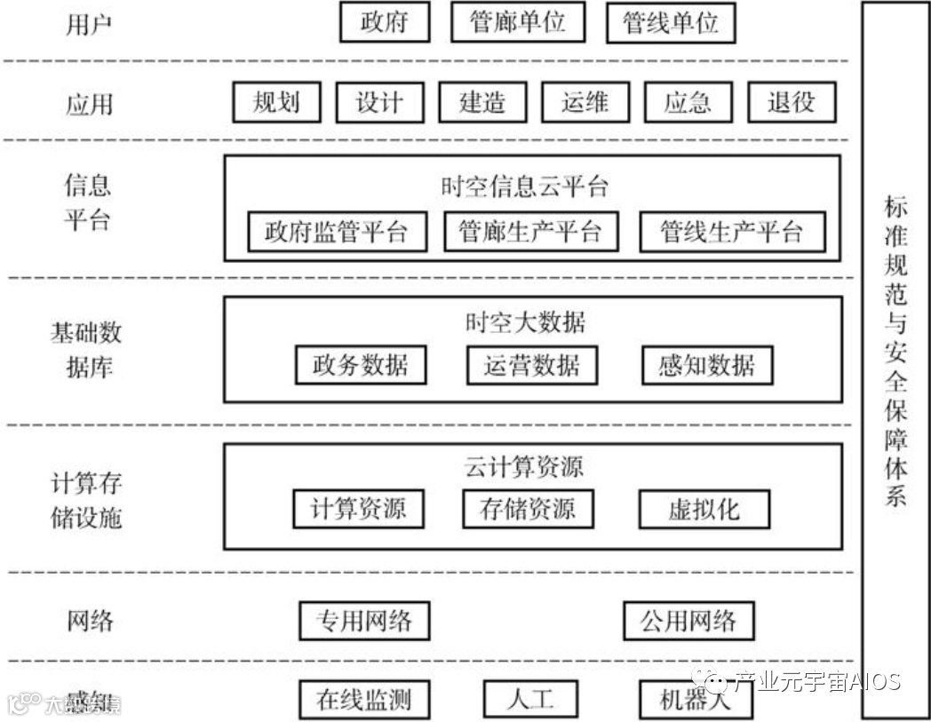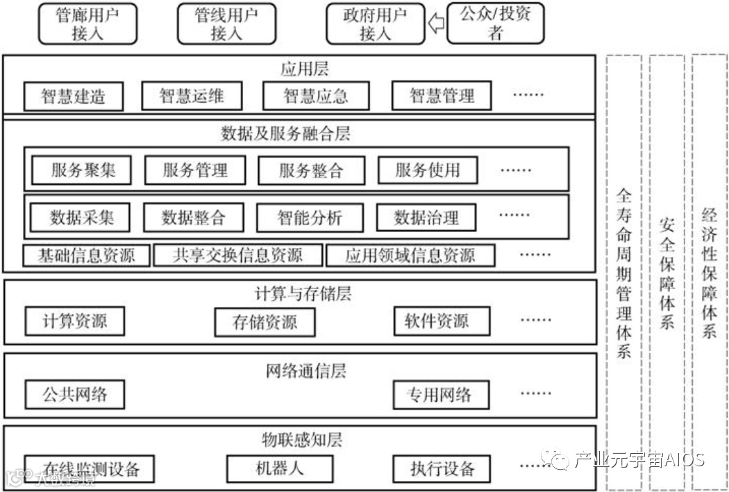 此外,通过建立统一管理与信息服务平台,采用传统的基于设施在线监控的运营模式与信息技术运营模式相结合的方式,并考虑与智慧城市架构体系的统一与兼容性,构建智慧城市综合管廊的技术架构和体系。