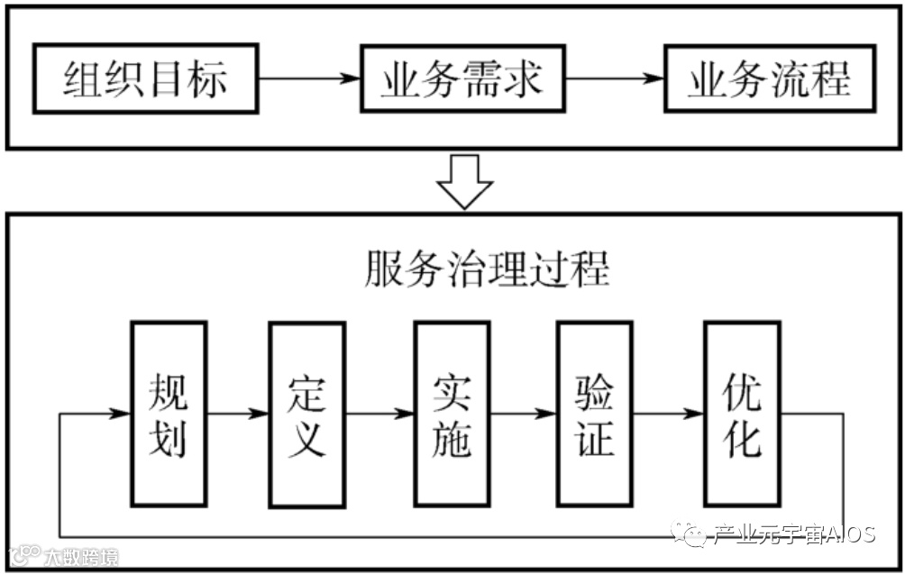 服务治理是一个不断迭代的过程,包括服务的规划、定义、实施、验证和优化全寿命周期,与组织的目标、业务需求和流程密切相关,图6-14给出了服务治理的过程示意图。
