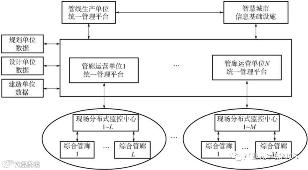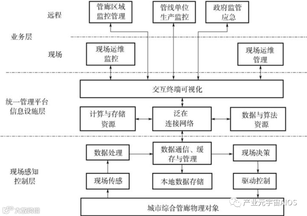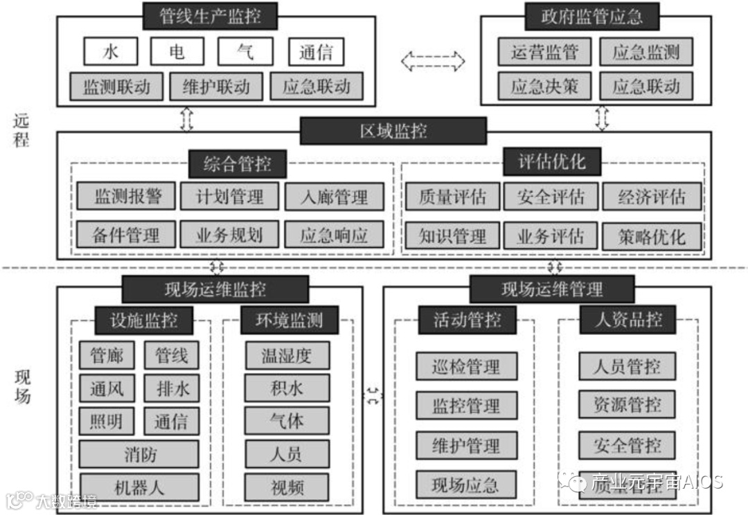 管廊运营单位的区域监控和管线单位的生产监控以及政府的监管和应急构成了城市综合管廊智慧运维的远程业务。