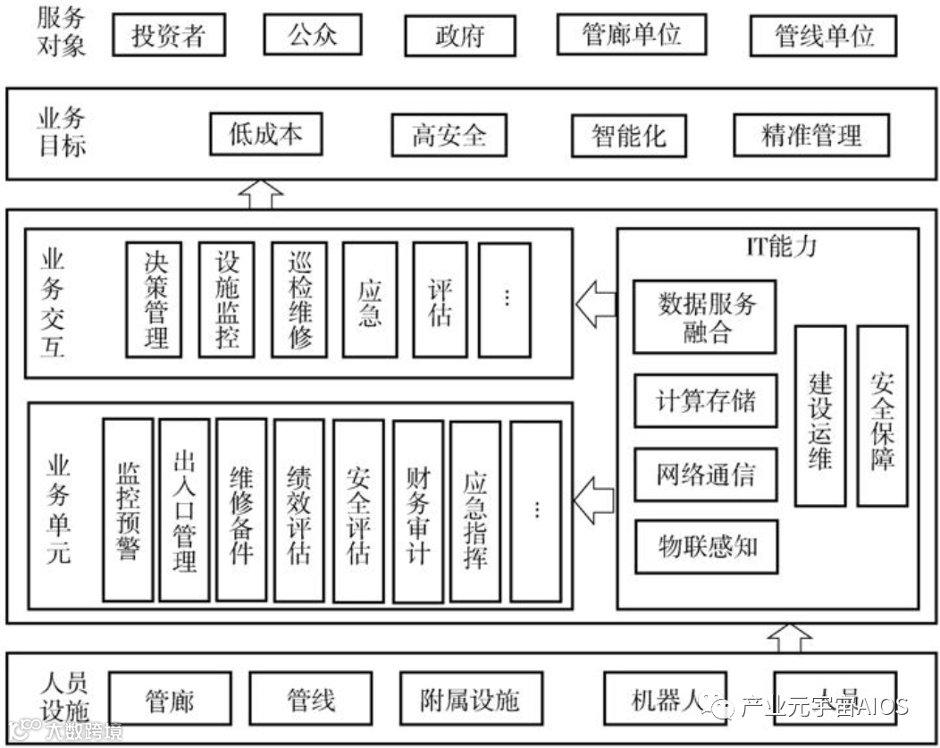 智慧城市综合管廊的业务框架是建立在信息技术(IT)能力基础之上的,包括业务目标、业务单元、业务交互和IT能力四个部分。