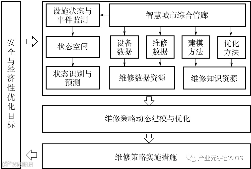 城市综合管廊的安全与经济性目标决定了维修策略及其优化,智慧城市综合管廊运维策略是建立在信息基础设施基础之上的,采用数据与知识融合的方法进行维修策略的建模和动态优化。