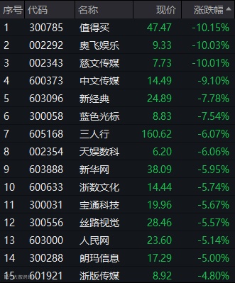 本周以来,连续上演涨停潮的AI应用方向,尤其是传媒和游戏板块今日大跌。此前收获5连板的奥飞娱乐、3连板的慈文传媒跌停。ChatGPT板块也跌幅居前。