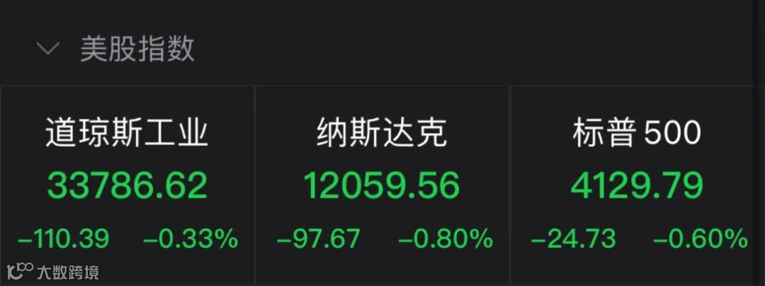 周四,美股三大指数全线下跌,截至收盘,道指跌0.33%,报33786.62点,连续第三日下跌,标普500指数跌0.6%报4129.79点,纳指跌0.8%报12059.56点。