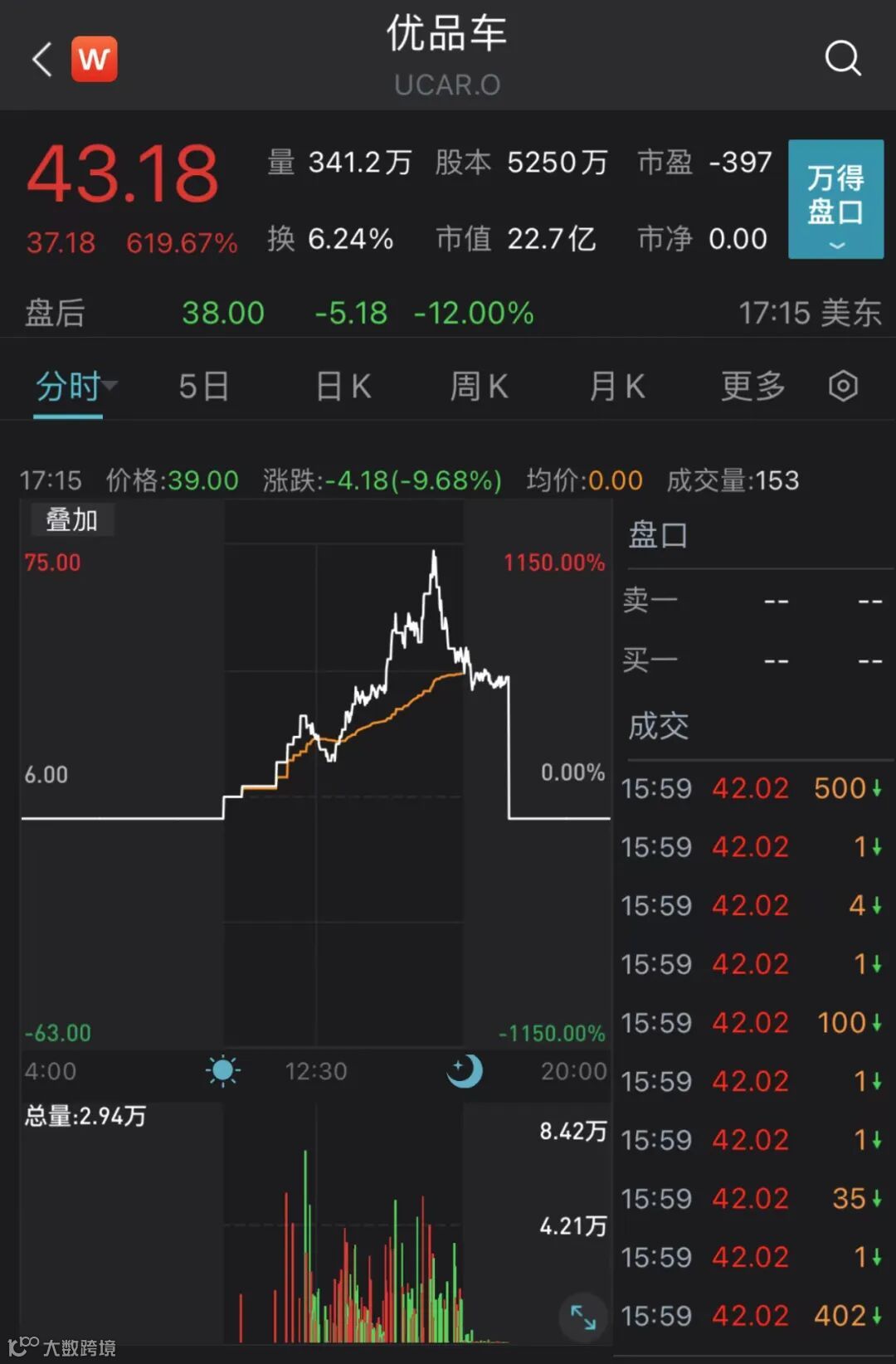 美东时间周四,致力于提供商用新能源车换电解决方案的优品车(U Power Limited)登陆纳斯达克。因股价波动极大,优品车盘中至少暂停交易22次,但并未影响股价迅猛涨势。午盘优品车股价进一步走高,一度涨至75美元,日内涨幅达1150%,最终收报43.18美元/股,涨幅619.7%,创今年以来美股新股上市首日的最佳表现。