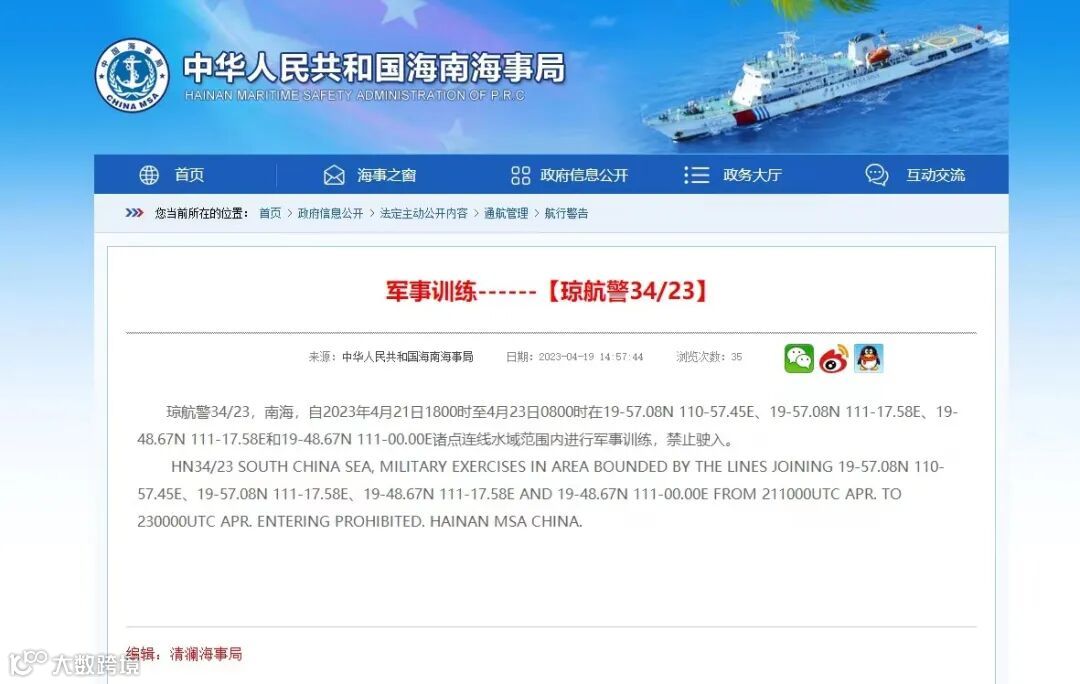 清澜海事局日前发布航行警告,琼航警34/23,南海,自2023年4月21日1800时至4月23日0800时在19-57.08N 110-57.45E、19-57.08N 111-17.58E、19-48.67N 111-17.58E和19-48.67N 111-00.00E诸点连线水域范围内进行军事训练,禁止驶入。