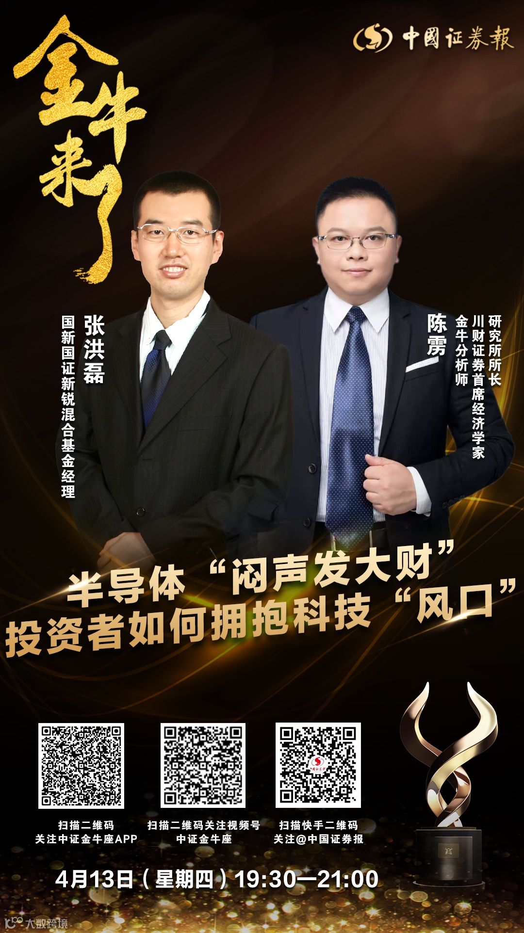 4月13日(周四)晚7点半,国新国证新锐混合基金基金经理张洪磊,以及金牛分析师、川财证券首席经济学家、研究所所长陈雳将做客中证报“金牛来了”直播间,围绕“半导体‘闷声发大财’,投资者如何拥抱科技‘风口’”为你在线答疑解惑。
