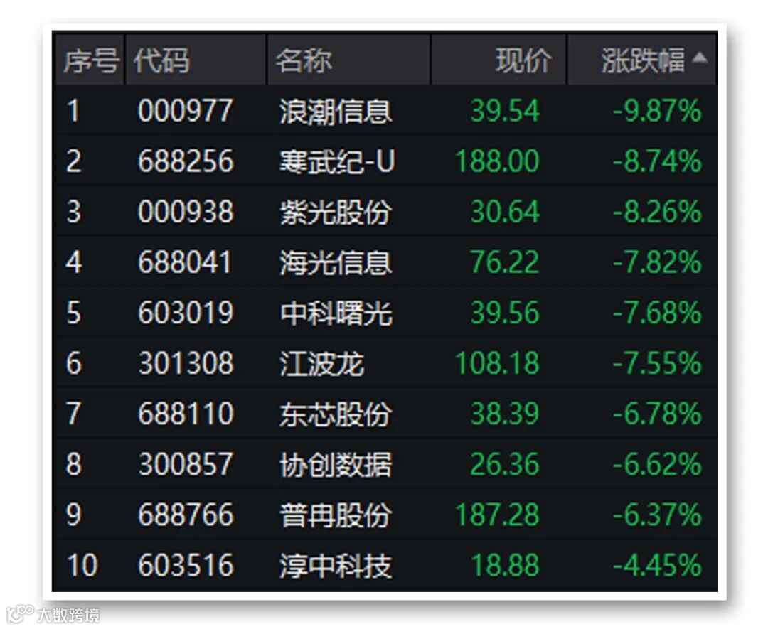 二是“高处不胜寒”——除传媒外的AI概念、数字经济概念集体熄火,AI算力、存储、芯片等板块集体重挫,浪潮信息逼近跌停,寒武纪跌近9%。