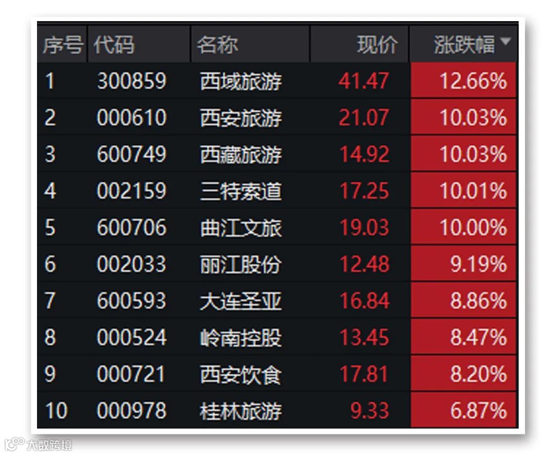 餐饮旅游板块中,西域旅游午后从跌逾3%一度拉涨至逾15%,西安旅游、西藏旅游和三特索道均在尾盘封板。