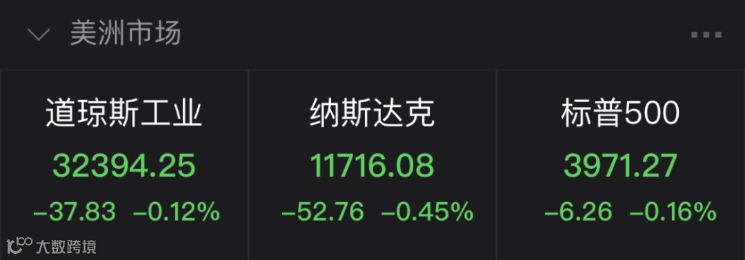 当地时间3月28日,美国三大股指小幅收跌。道指跌0.12%报32394.25点,标普500指数跌0.16%报3971.27点,纳指跌0.45%报11716.08点。