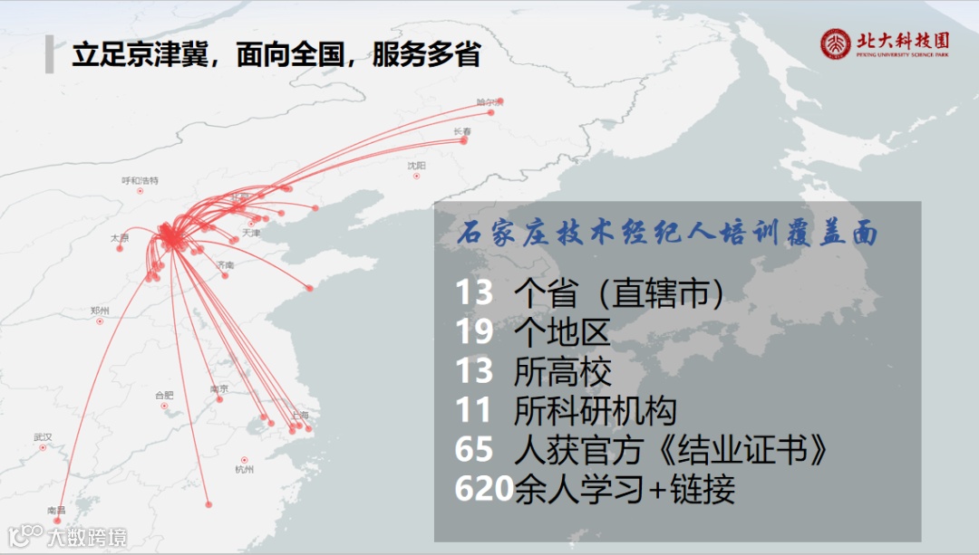 培训立足京津冀、辐射全国,覆盖13个省(直辖市),19个地区,13所高校,11个科研机构,共计600余人全程跟踪学习,百余人报名结业考试,65人成功取得北京技术协会、北京经纪人协会联合颁发的官方《技术经纪人(技术经理人)培训结业证书》。