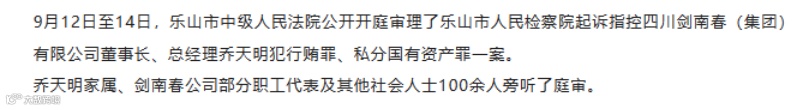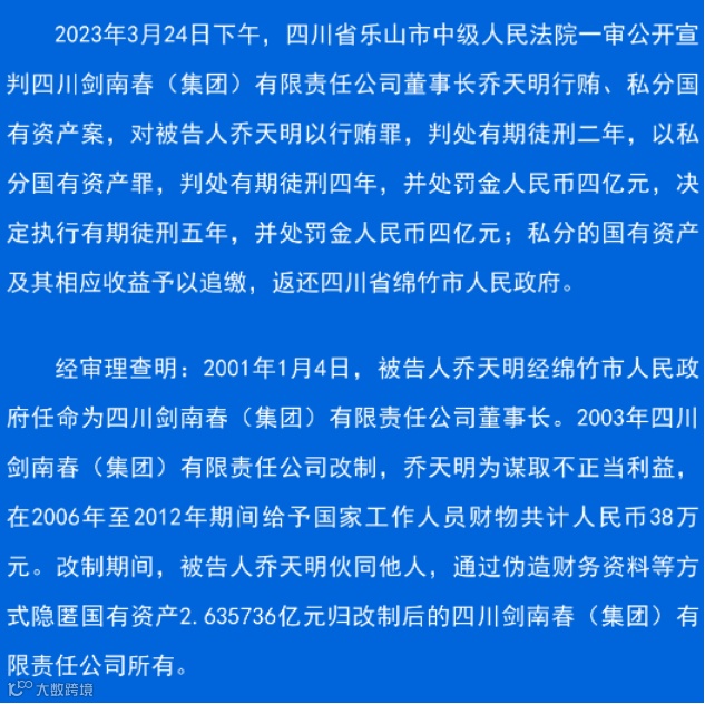 3月24日晚,乐山中院(四川省乐山市中级人民法院)官方微信公众号发布四川剑南春(集团)有限公司(简称“剑南春集团”)董事长、总经理乔天明行贿、私分国有资产案一审判决,乔天明被判有期徒刑五年,并处罚金四亿元。私分的国有资产及其相应收益予以追缴,返还四川省绵竹市人民政府。