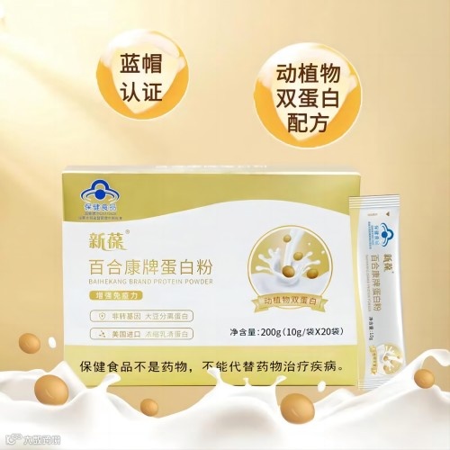 新葆百合康牌蛋白粉:双蛋白营养更全面!动物蛋白与植物蛋白氨基酸种类与配比不同,双蛋白一同补充,能够发挥氨基酸互补作用,更好地满足身体需要。