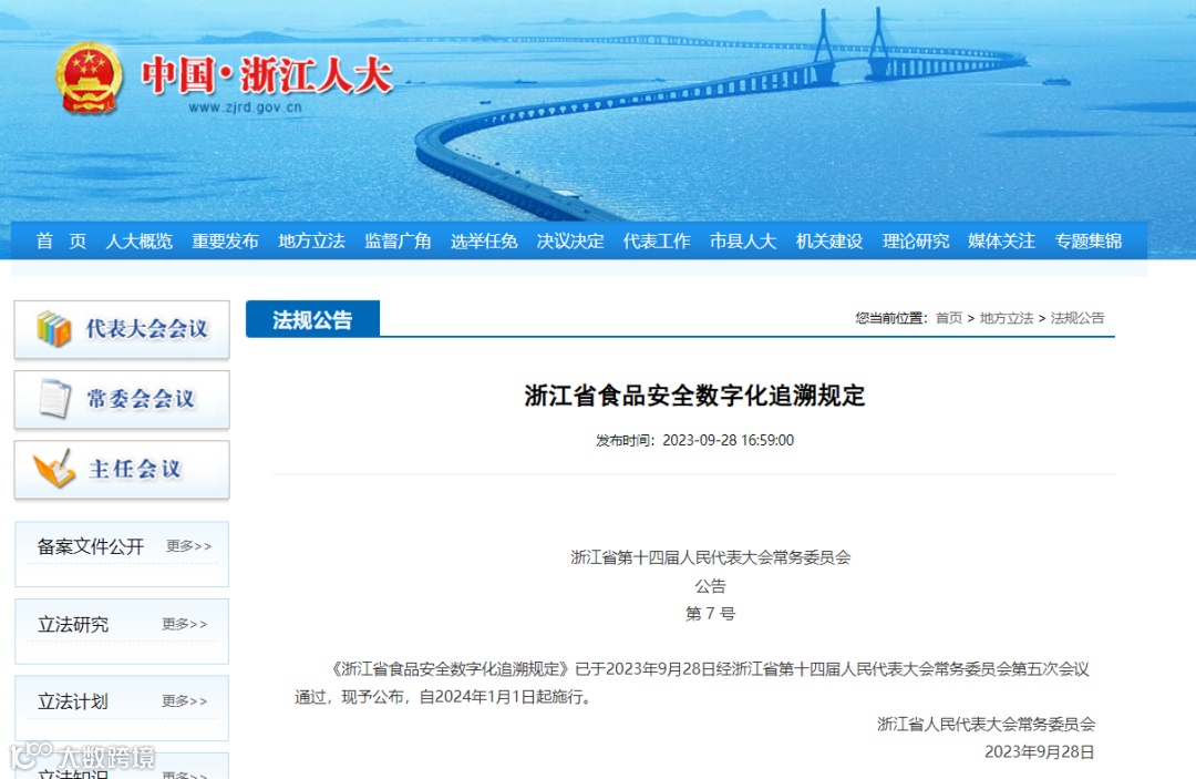 近日,浙江省人大常委会审议通过《浙江省食品安全数字化追溯规定》。《规定》要求,通过全省统一的食品安全追溯管理系统,依法采集、留存、传递、应用生产经营相关追溯信息,实现规定类别、品种的食品和食用农产品来源、去向、问题可追溯。《规定》将自2024年1月1日起施行。