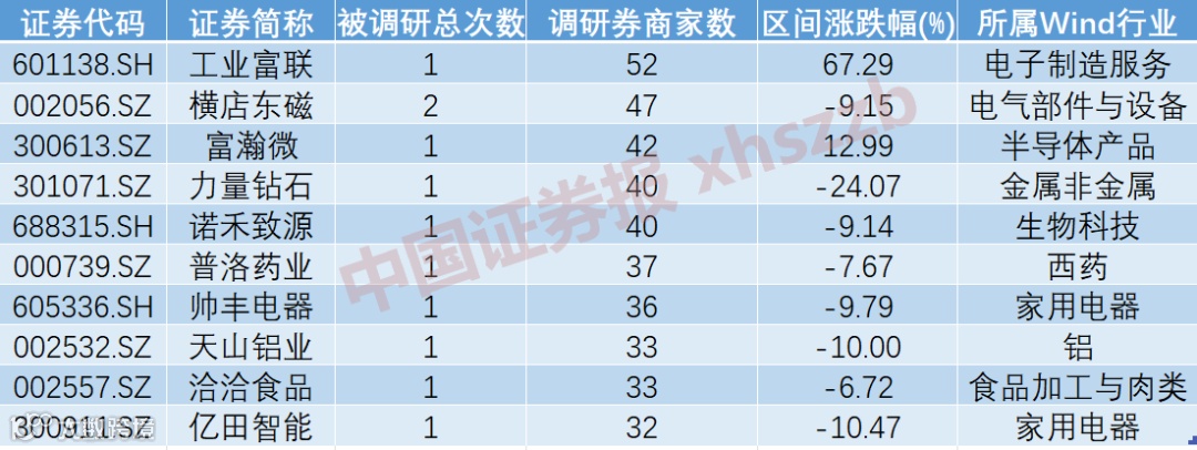 个股调研热度方面,截至3月22日,3月以来数字经济龙头工业富联最受券商青睐,累计获52家券商调研;横店东磁、富瀚微、力量钻石、诺禾致源累计获得不少于40家券商调研;普洛药业、帅丰电器紧随其后,被不少于35家券商调研。