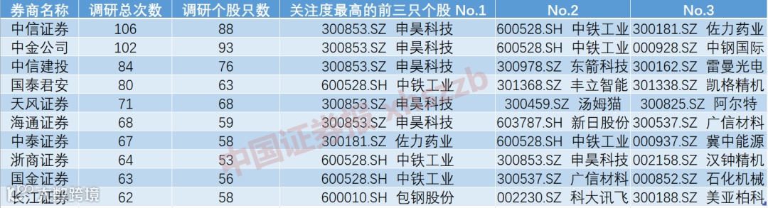 从券商调研次数排名看,中信证券以106次调研稳坐第一,中金公司以102次调研居于第二位,中信建投以84次调研跻身第三,国泰君安、天风证券、海通证券等券商调研亦较为积极,共有15家券商累计调研次数超50次。