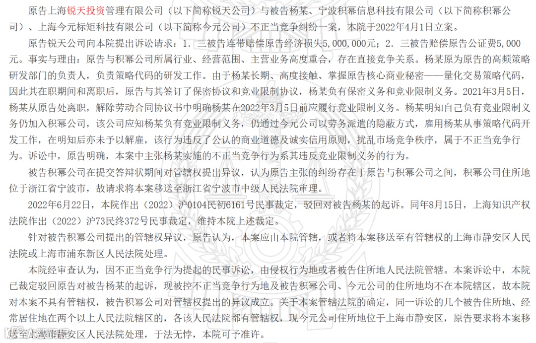 据此前公布的裁判文书,原告提交的诉讼显示,杨某浩原为上海锐天投资的高频策略研发部门的负责人,负责策略代码的研发工作。由于杨某浩长期、高度接触、掌握上海锐天投资的核心商业秘密,即量化交易策略代码,因此,其在职期间和离职后,上海锐天投资与其签订了保密协议和竞业限制协议,杨某浩负有保密义务和竞业限制义务。