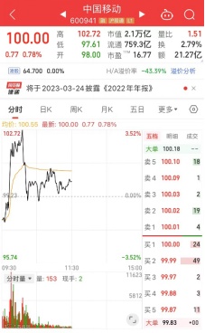 就在市场以为中国移动将一举超过贵州茅台,“临门一脚”的时刻,中国移动突然跳水了,股价直线下跌。上午收盘,中国移动上涨0.78%,总市值为2.1万亿元,贵州茅台总市值为2.2万亿元。