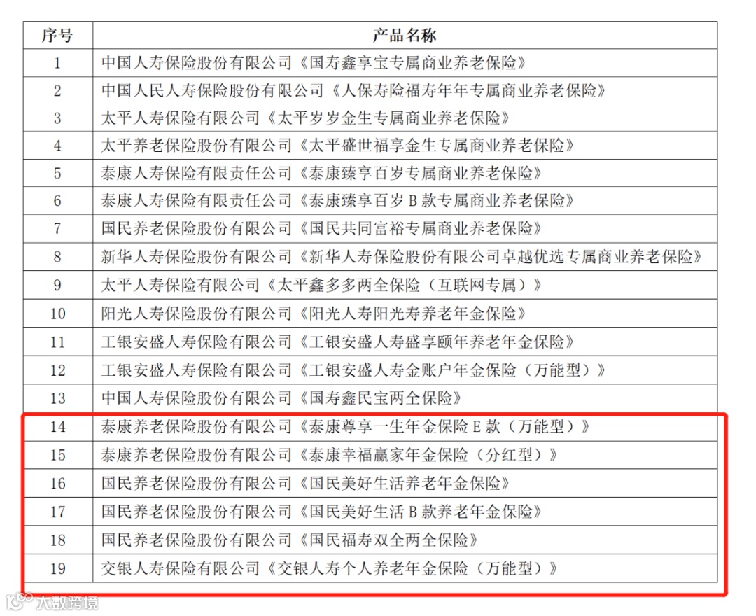 泰康养老、交银人寿两家公司的产品首次被纳入个人养老金保险产品名单,包括泰康养老的 “泰康尊享一生年金保险E款(万能型)”“泰康幸福赢家年金保险(分红型)”,以及交银人寿的“交银人寿个人养老年金保险(万能型)”等产品。