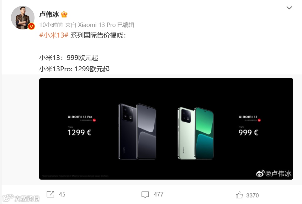 2月26日晚,小米13系列国际版在新一届世界移动通信大会(MWC 2023)发布会上推出,正式登欧洲市场,售价分别为999欧元起(折合约人民币7329元)、1299欧元起(折合约人民币9530元)。