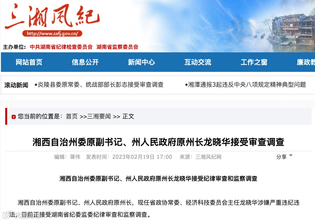 2022年12月21日,湘西自治州委召开领导干部会议。会上宣布,龙晓华同志不再担任中共湘西自治州委副书记、常委、委员职务,另有任用。今年1月赴任湖南省政协经济科技委员会主任,1个月后落马。