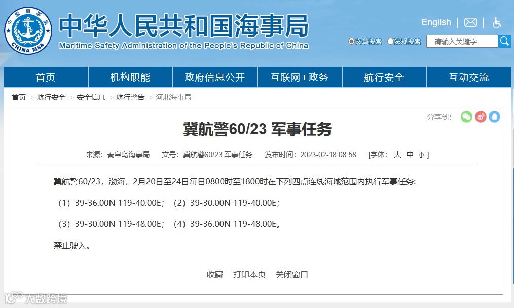 海事局发布航行警告,自2月20日至24日每日8时至18时,渤海部分海域执行军事任务,禁止驶入。