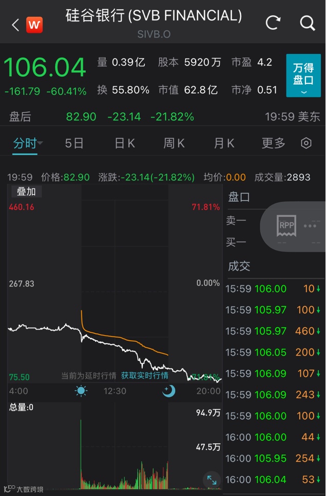 然而市场并不买账,在这一消息宣布后,SVB金融集团股价遭遇闪崩。截至当地时间周四收盘,其股价暴跌60.41%,创历史最大跌幅,市值损失超100亿美元。