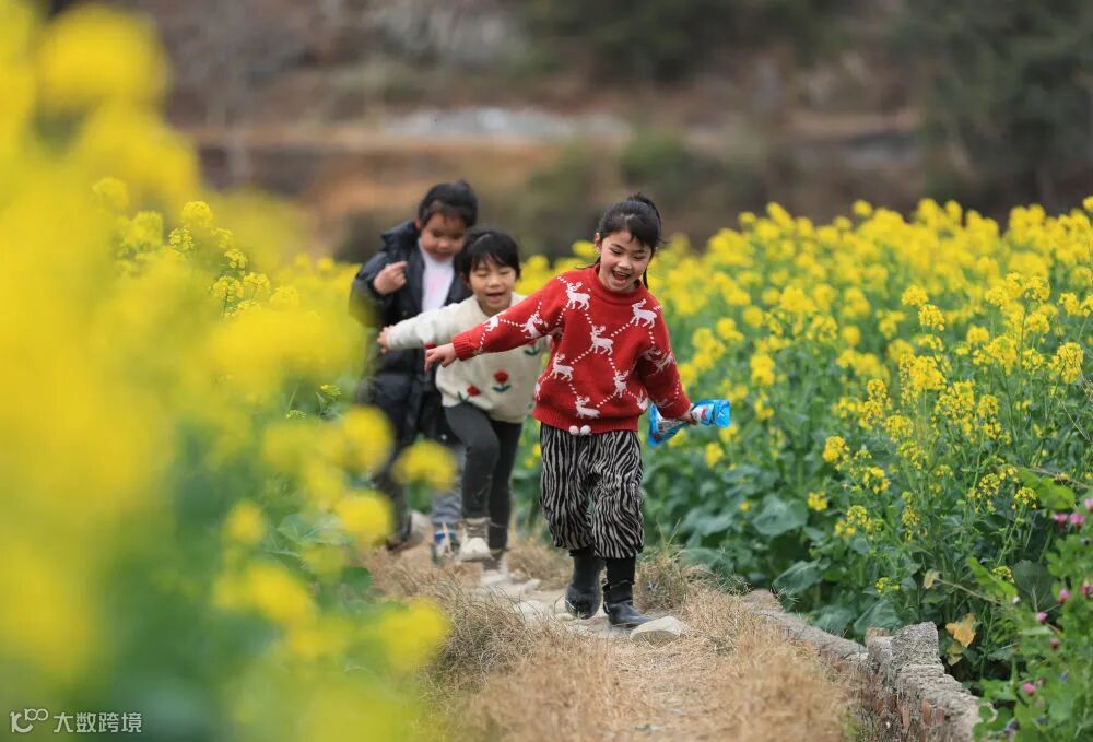 小朋友在贵州省从江县洛香镇上皮林村的油菜花田间玩耍(2月19日摄)。