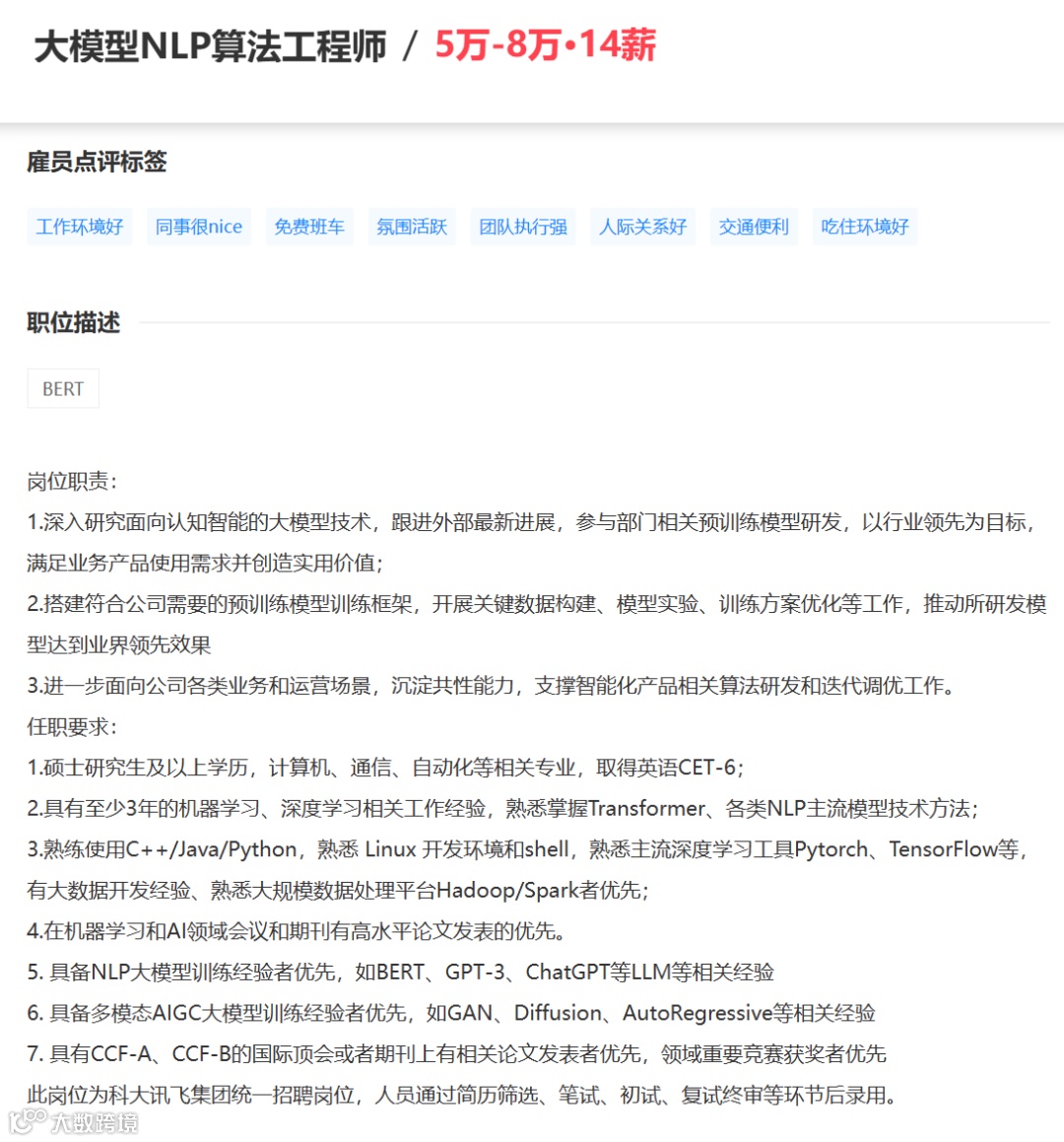 科大讯飞在招聘网站上发布的信息显示,招聘1名大模型NLP算法工程师,岗位月薪在5万-8万元,14薪/年。要求应聘者具有至少3年的机器学习、深度学习相关工作经验,熟悉掌握Transformer、各类NLP主流模型技术方法,硕士研究生及以上学历,计算机、通信、自动化等相关专业和一定等级英语水平。
