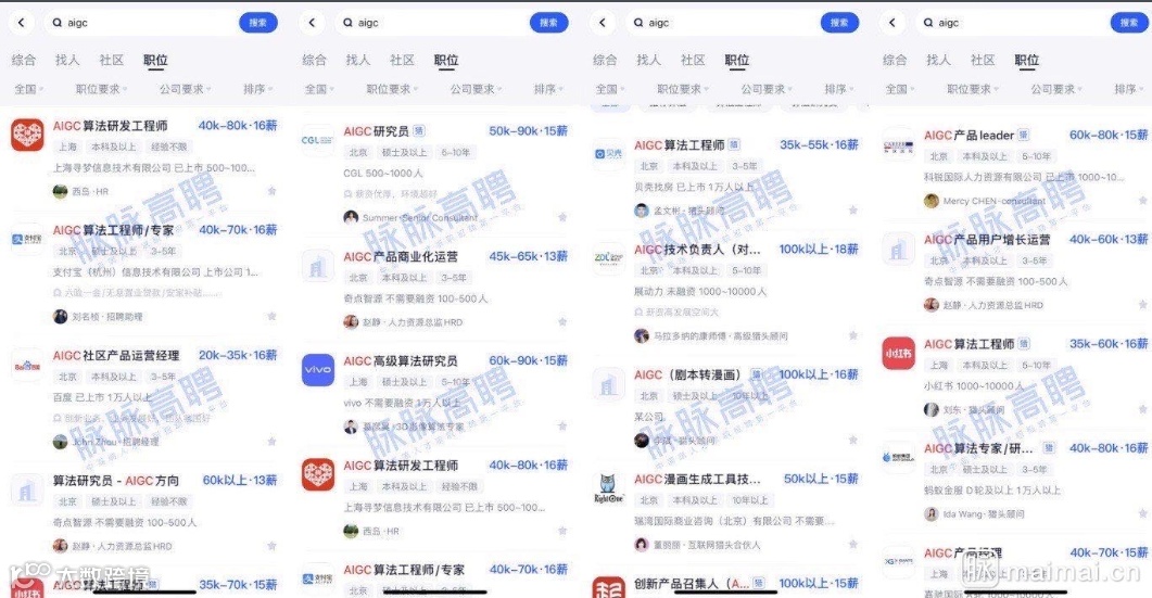 招聘平台脉脉CEO林凡在社交平台上发文称:“互联网、电商、智能硬件大厂纷纷发力招聘,百度、支付宝、vivo大厂全力开抢AIGC人才。知名猎头CGL等公司挂出10万月薪岗位开始抢人。”该文同时配有一张招聘信息图。记者注意到,图中不乏拼多多、vivo、小红书、蚂蚁金服等招聘企业。