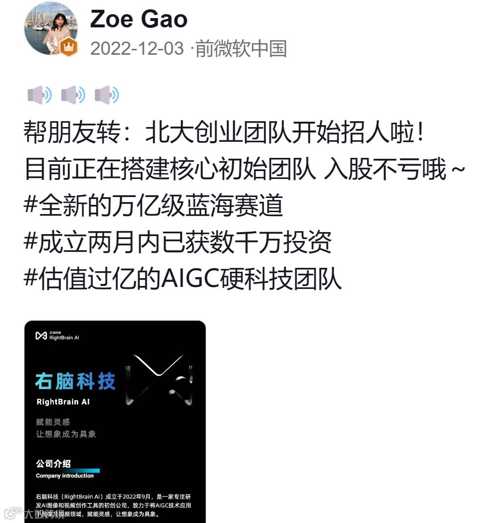此外,一些创业公司“招聘贴”上赫然打上“急招”“入股不亏”等字眼。创业公司右脑科技在招聘贴上写道,“全新的万亿级蓝海赛道”“成立两月内已获数千万投资”“估值过亿的AIGC硬科技团队”“创始团队具备微软、字节等科技大厂背景”,足以见得AIGC人才争夺局面有多火热。
