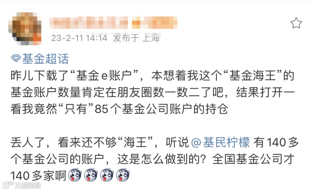 2月10日,公募基金账户份额信息统一查询平台“基金E账户”正式公开试运行。随即,朋友圈和微博掀起了基金“海王”大赛。