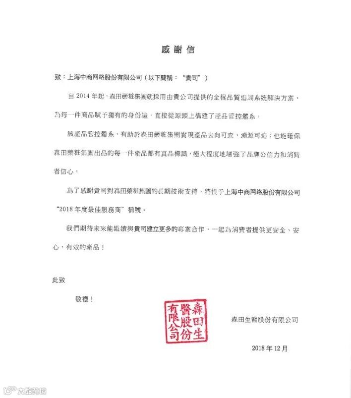 2019年1月 喜获森田药妆集团感谢信