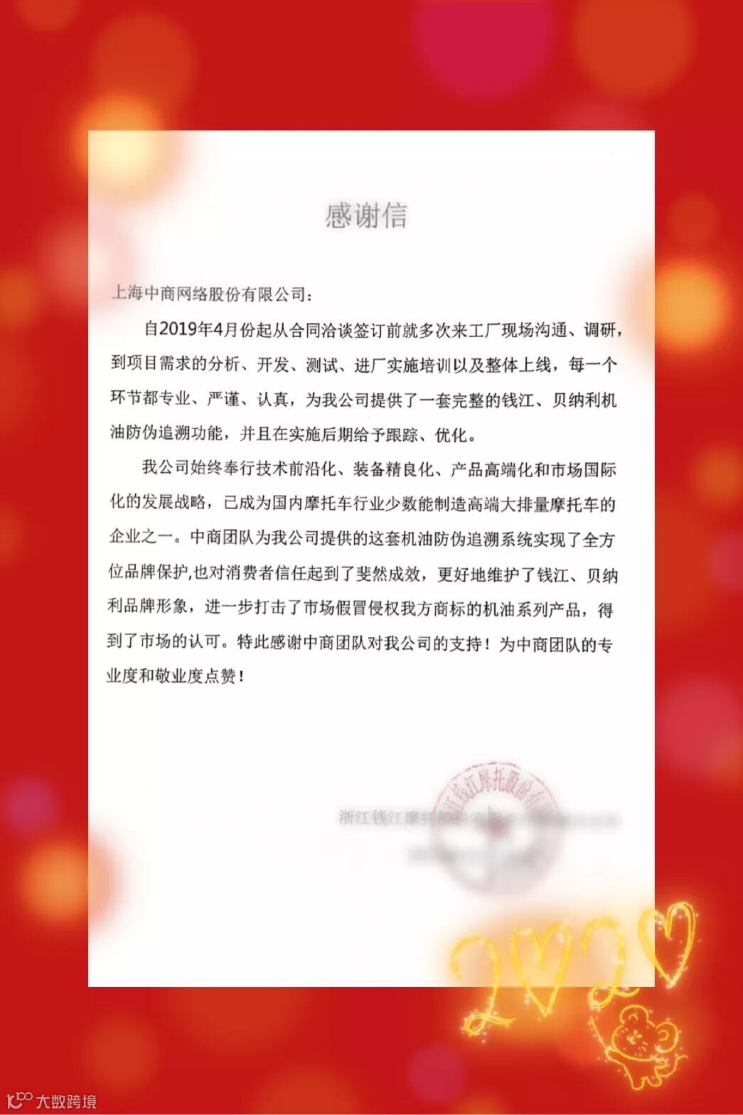 2019年12月 喜获钱江摩托感谢信