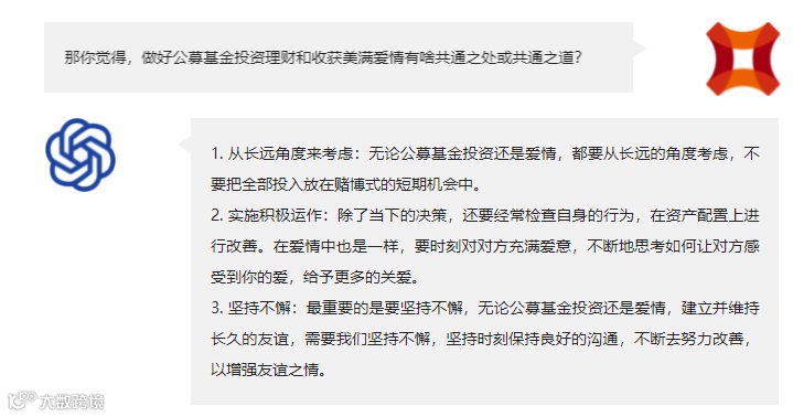 此外,财通基金则在和ChatGPT的聊天过程中,学到了恋爱与投资的“共通之道”:“一是从长远的角度考虑,不要把全部投入放在赌博式的短期机会中;二是经常检查自身行为,在资产配置上不断改善;三是坚持不懈,时刻保持良好的沟通,不断努力和改善。”