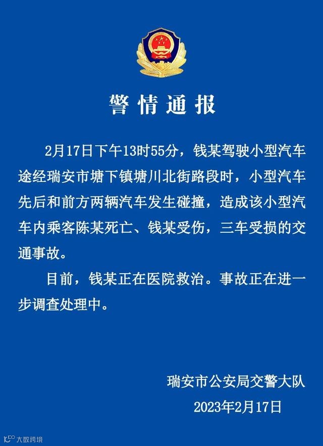 2月17日,瑞安市公安局交警大队通报:2月17日13时55分,钱某驾驶小型汽车途经瑞安市塘下镇塘川北街路段时,小型汽车先后和前方两辆汽车发生碰撞,造成该小型汽车内乘客陈某死亡、钱某受伤,三车受损的交通事故。目前,钱某正在医院救治。事故正在进一步调查处理中。