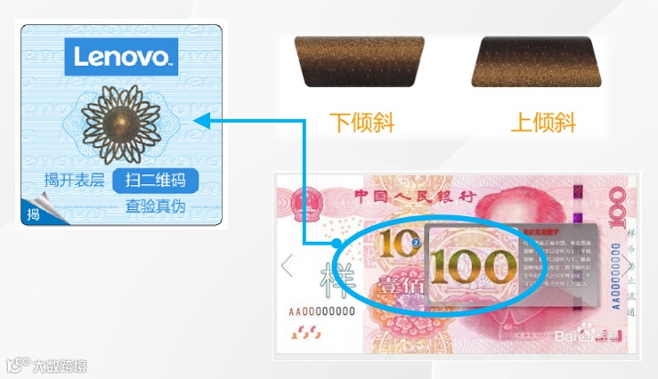 图案呈现3D滚动金色多彩效果,随视线变化,图案可发生明暗变化、色彩变化、形状渐变(棒槌状、球状、柱状)。肉眼识别直观、可靠、难复制。